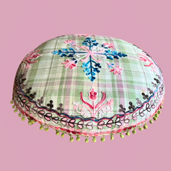 Een uniek rond kussen met een romantische uitstraling! Dit vintage kussen is uitgevoerd in een zachtgroene ruitstof met een rijk geborduurd bloemmotief in roze, blauw en crème. De speelse pomponrand maakt het helemaal af.