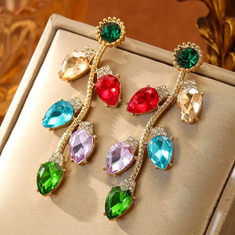 Steel de show met deze opvallende statement oorbellen! Deze luxe oorhangers zijn rijkelijk versierd met druppelvormige kristallen in levendige kleuren: rood, groen, paars, blauw, champagne en smaragdgroen. Elk steentje is prachtig ingelegd in een goudkleurige setting met extra accenten van fonkelende strass steentjes voor extra glamour.