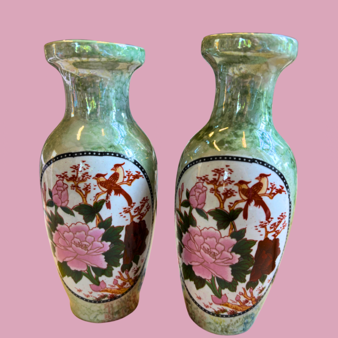 Hoe lief zijn deze groene pareltjes met een oosters bloemen- en vogeltjesmotief? Perfect voor een vintage touch in je interieur, op een dressoir, vensterbank of gezellig in een op een vintage kast.