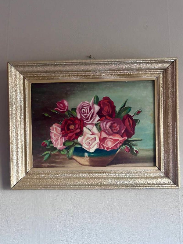Vintage Olieverf Schilderij met Rozen in Gouden Lijst