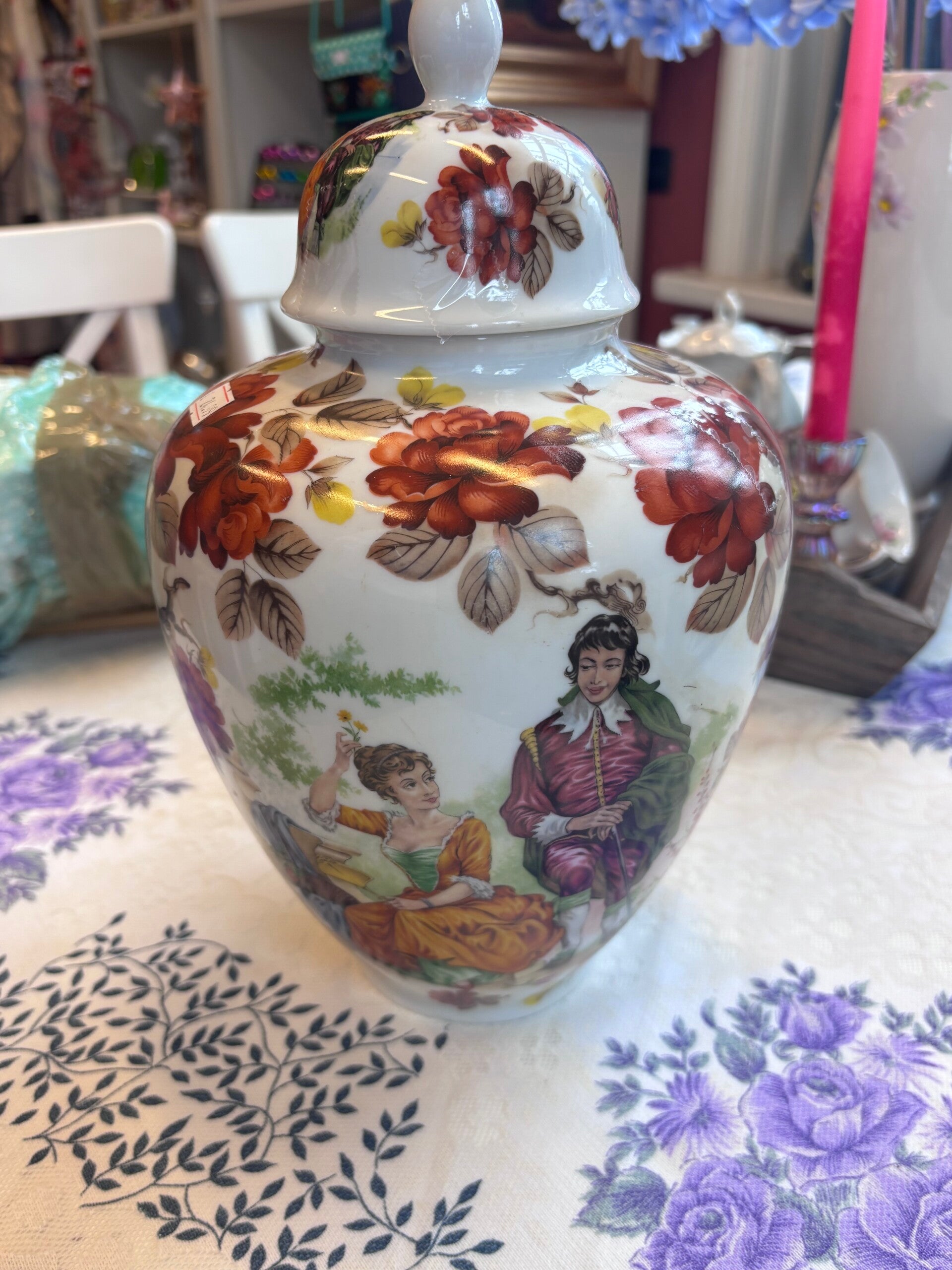 Deze prachtige porseleinen sierpot met deksel is een echte blikvanger voor liefhebbers van romantische en klassieke interieurs. De pot is rijk gedecoreerd met elegante bloemmotieven en sierlijke scènes in klassieke stijl, wat hem een luxe en tijdloze uitstraling geeft. Perfect als decoratief object op een kast, dressoir of kaptafel.