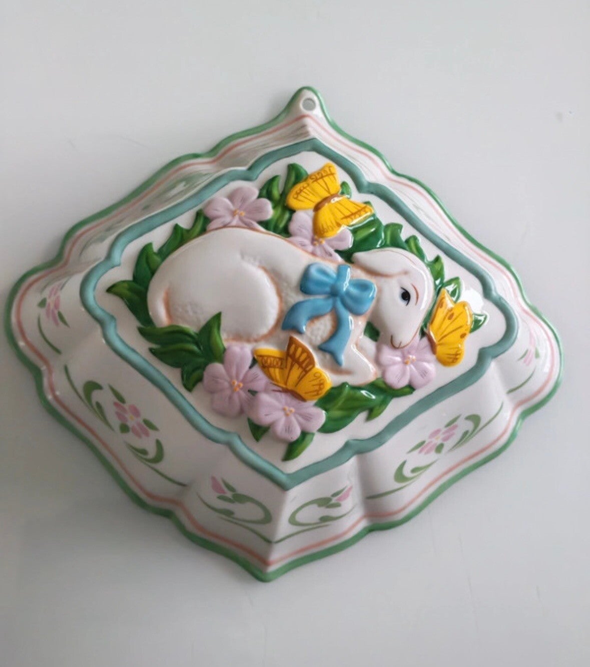Deze bijzondere schaal is uitgevoerd in reliëf met een lief konijntje, pastel bloemen en vlinders – een echte eyecatcher voor een landelijke keuken, brocante interieur of shabby chic wanddecoratie.