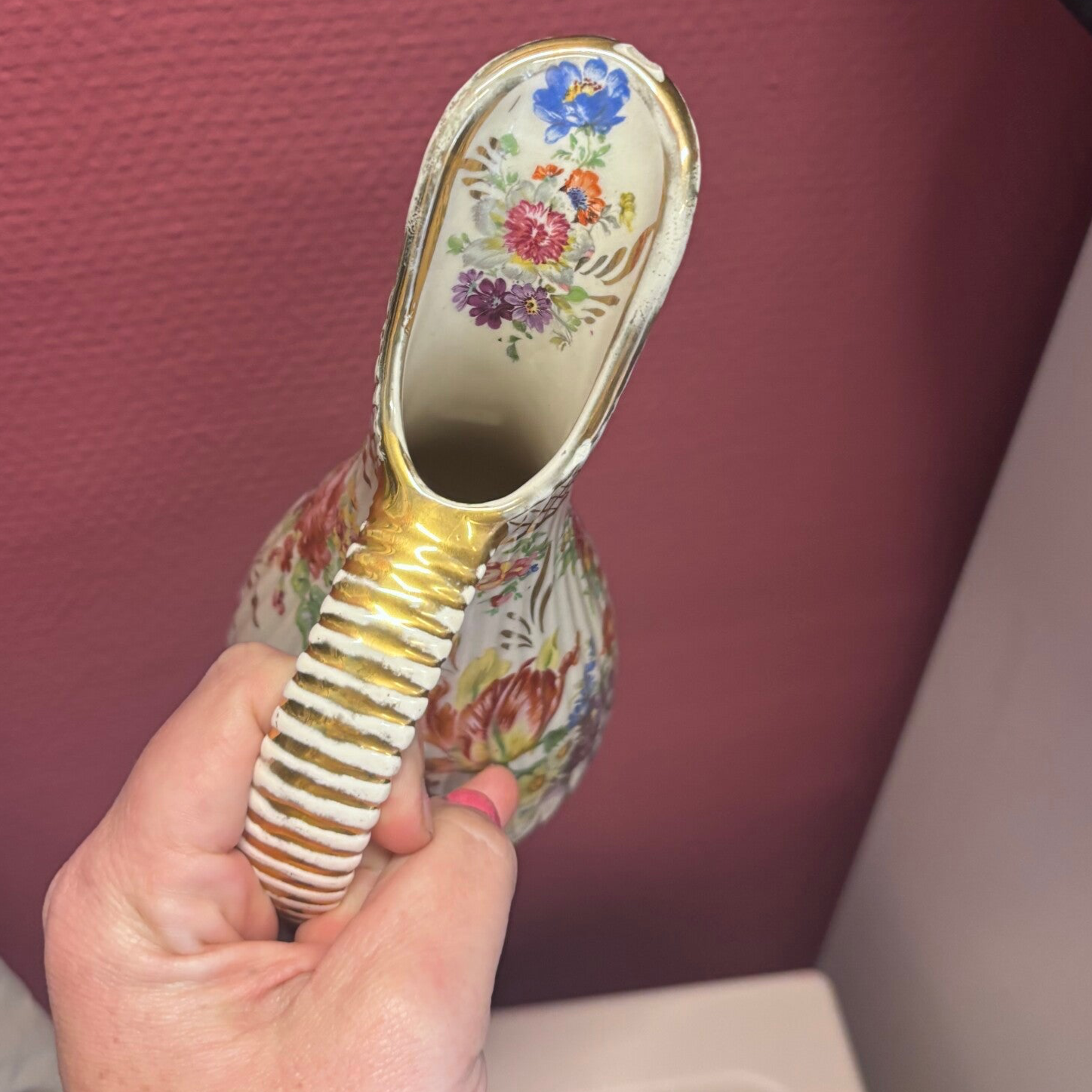 Deze prachtige vintage porseleinen kan / vaas met bloemenmotief is een echte blikvanger in een romantisch of brocante interieur. De elegante vorm, het verfijnde handvat met goudaccenten en het kleurrijke bloemenpatroon geven dit stuk een charmante en klassieke uitstraling.