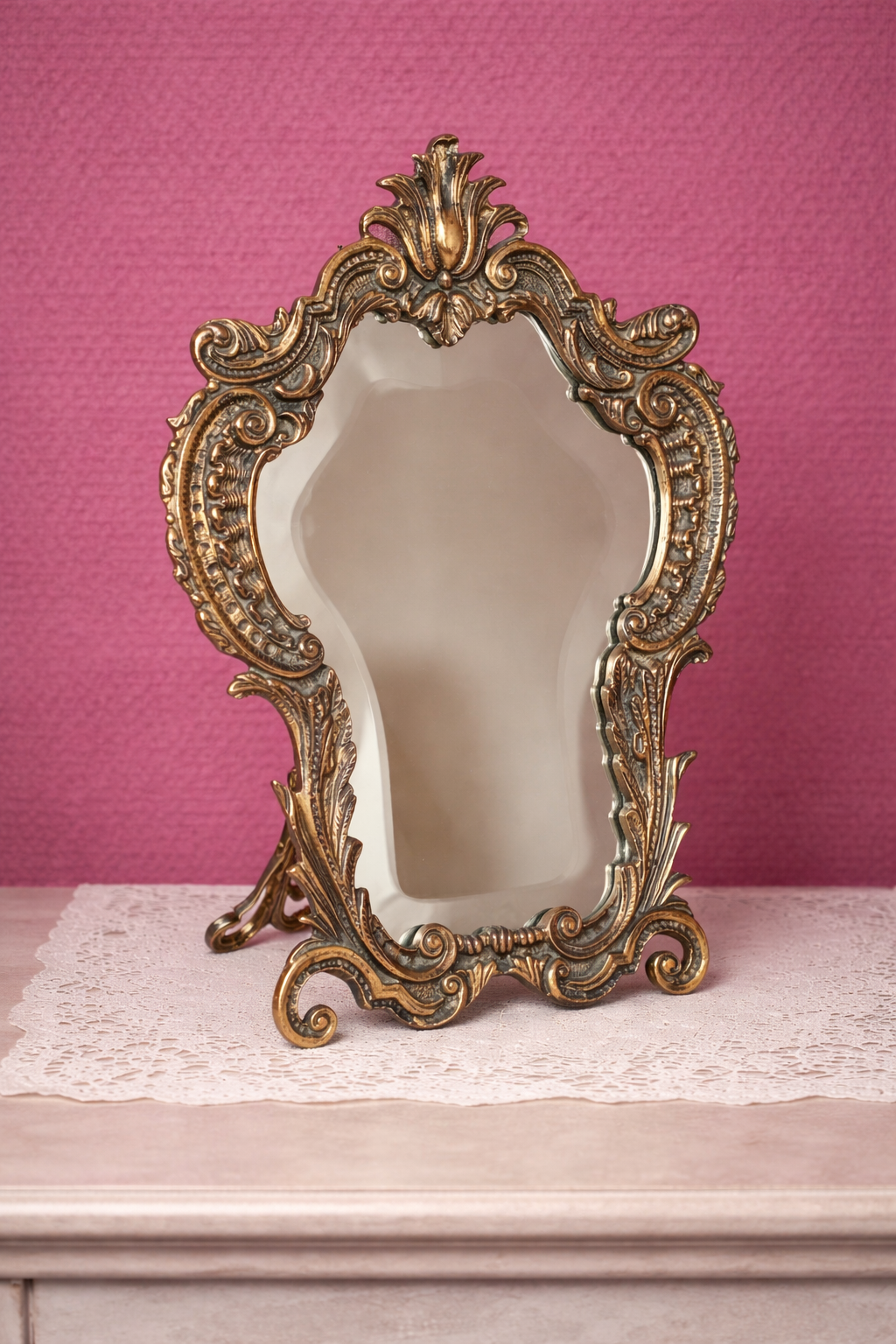 Deze decoratieve spiegel past perfect in een brocante, vintage of hotel chic interieur. Mooi op een kaptafel, dressoir, kast of in een open vitrinekast. Door het rijke barok ontwerp is deze spiegel een echte blikvanger in huis.
